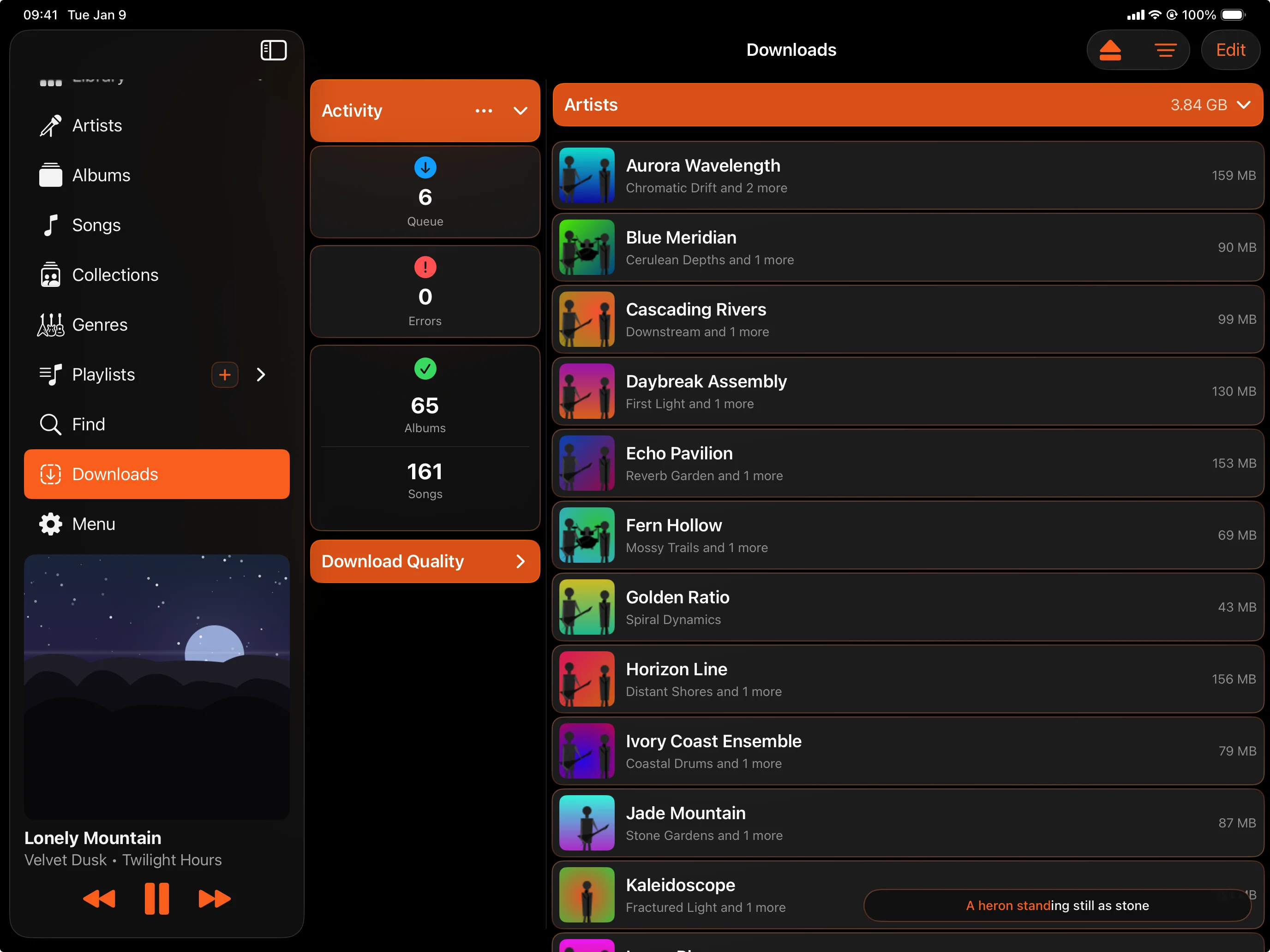 A 40-track album on flaky Wi-Fi won't start over when you switch networks. Each download backgrounds, pauses on no-signal, and resumes the instant you're back, even after the app closes.