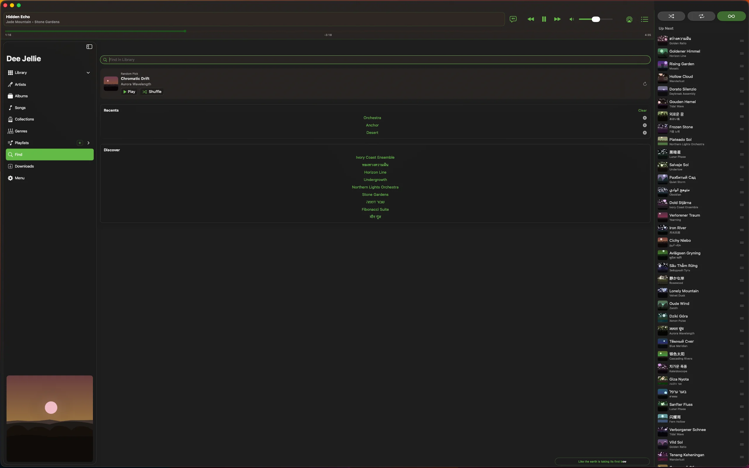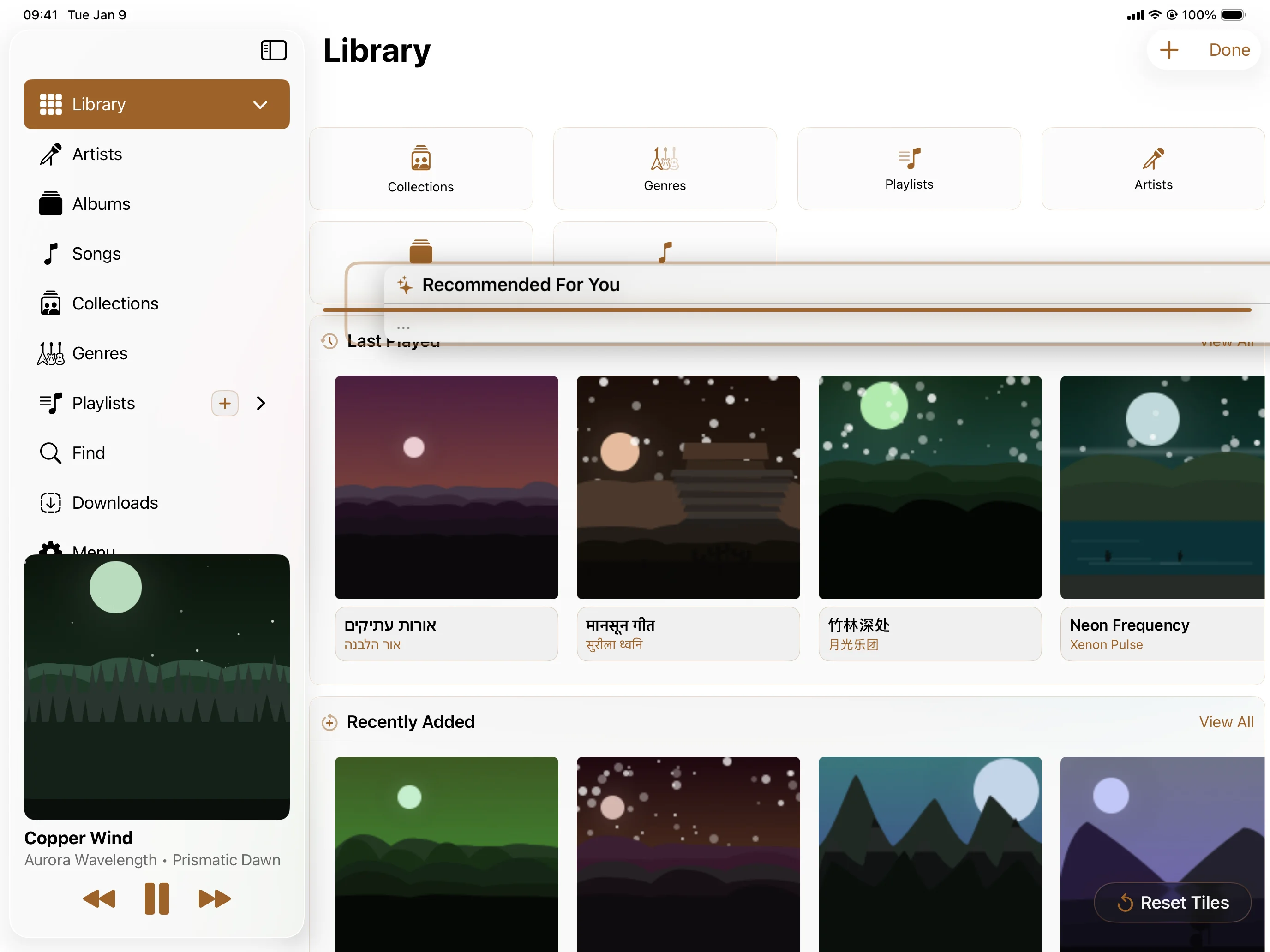 A home screen you shape. Grid-or-list per section. Details that read like liner notes. Queues that survive a reboot. And a single playlist that pulls from every server you're signed into.