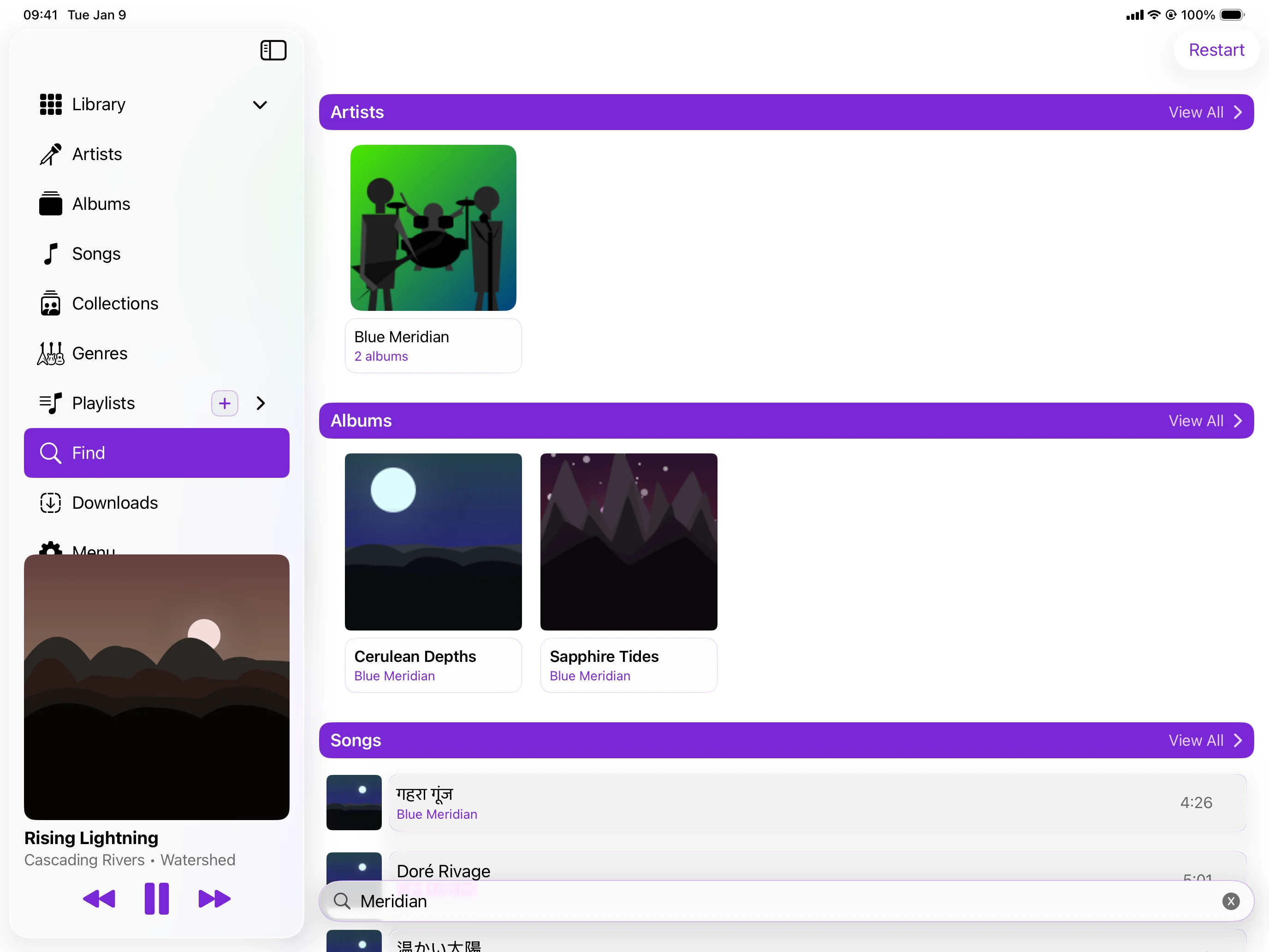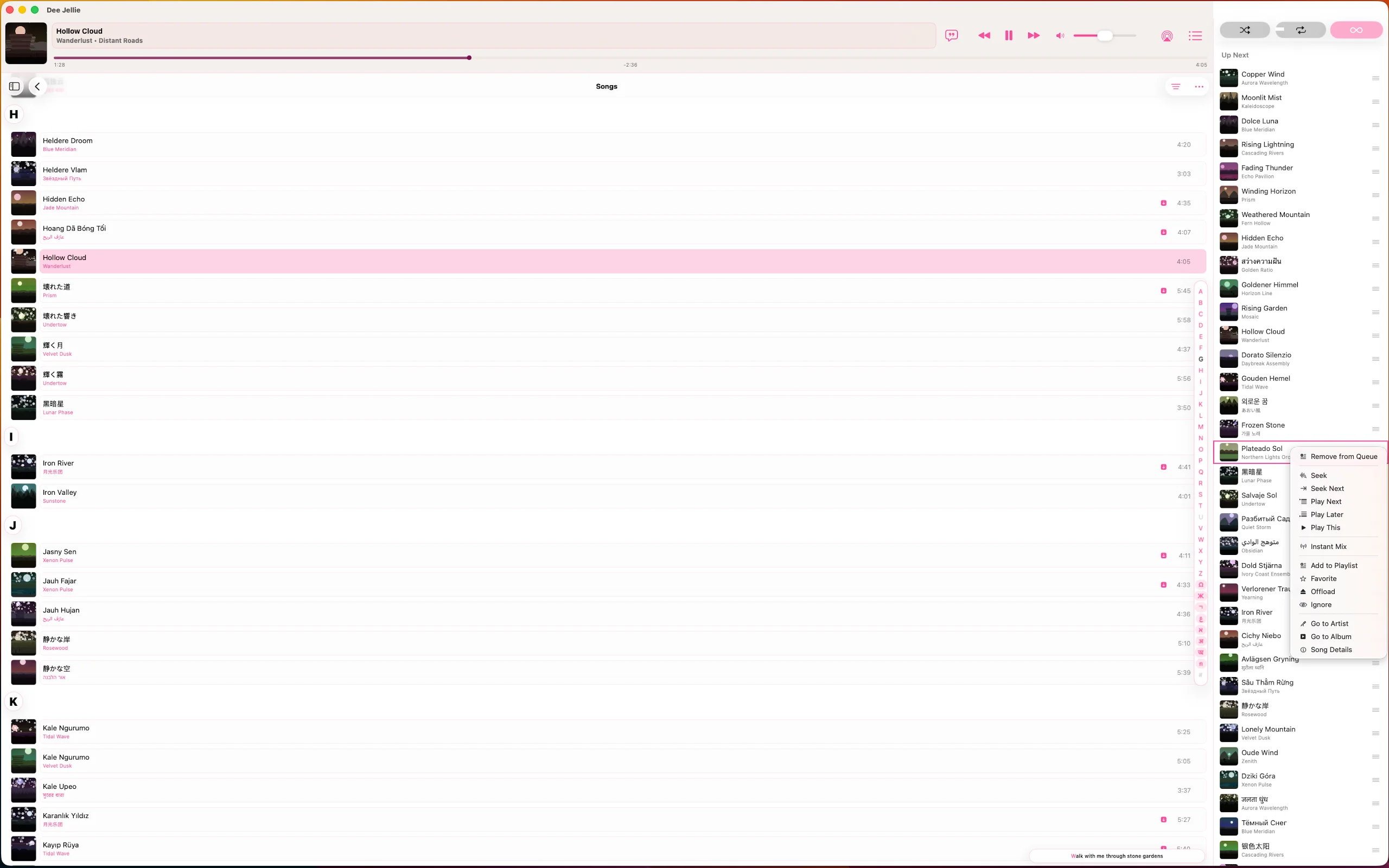 One playlist, songs from everywhere you've signed in. Jellyfin out of the box, Subsonic once you've unlocked Drac's Jukebox. iCloud syncs it to every device on your Apple ID, and the servers remain blissfully unaware of each other.