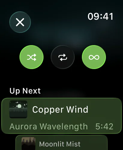 Shuffle without losing your place. The original order snaps back the moment you toggle it off. Repeat the song, the whole queue, or neither.